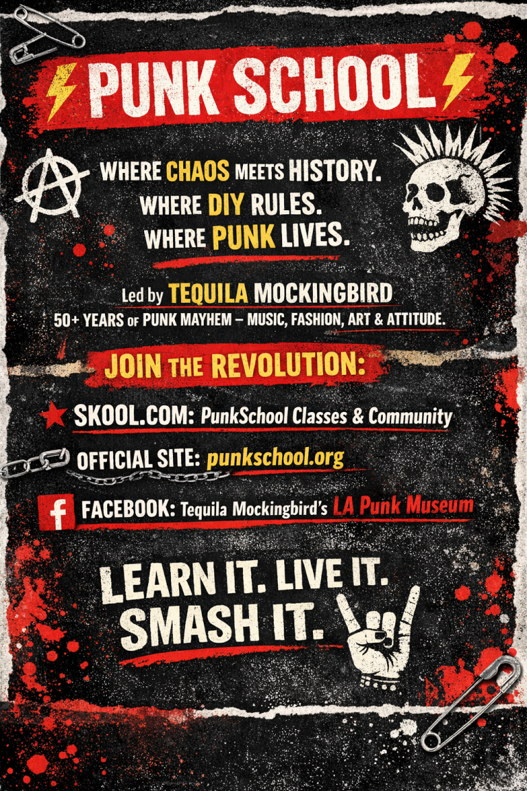 Led by Tequila Mockingbird, PunkSchool brings together enthusiasts, musicians, and scholars for a deep dive into punk music, fashion, art, and lifestyle. • Online Community & Courses: Join our interactive classes, discussions, and events at PunkSchool on Skool.com •
